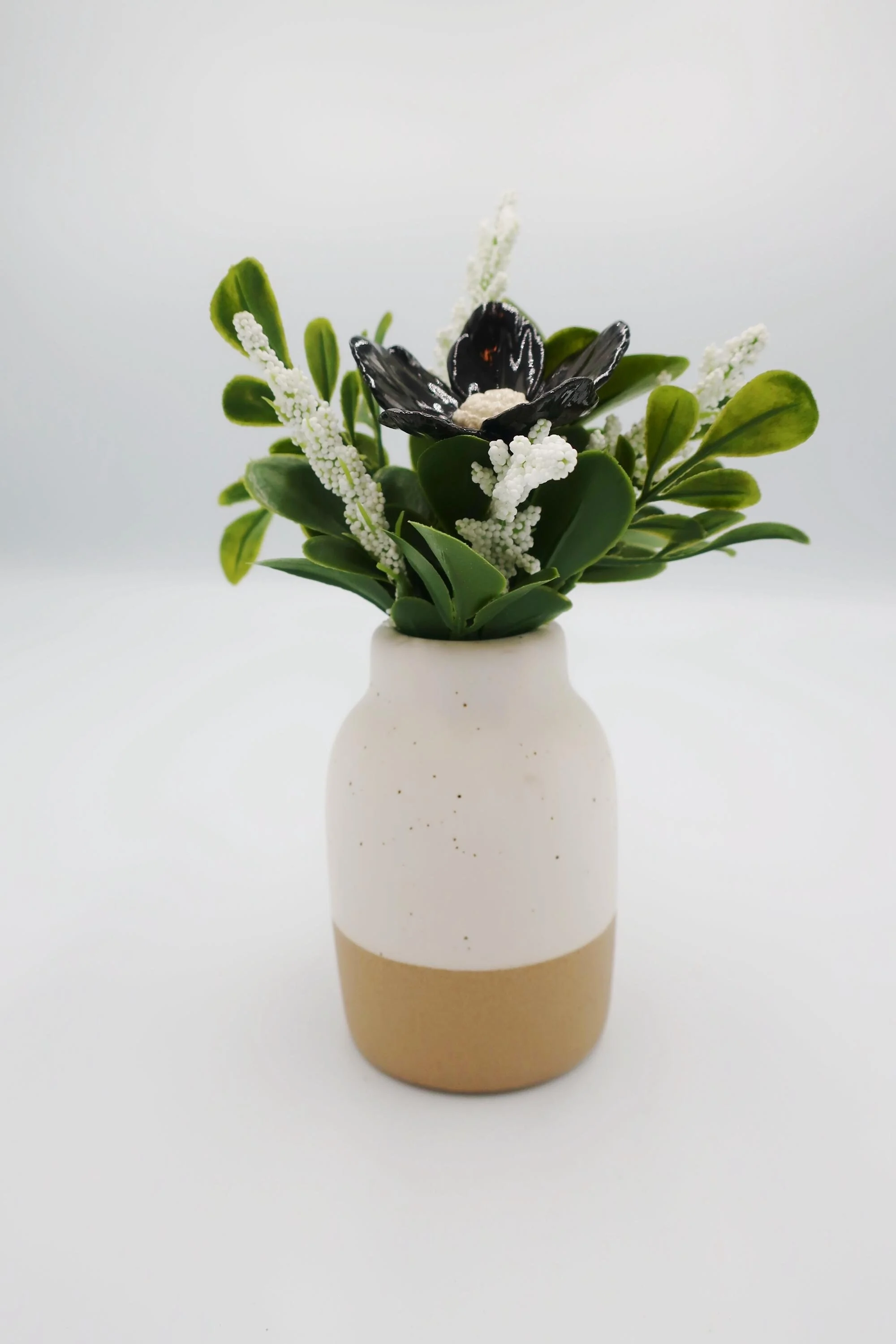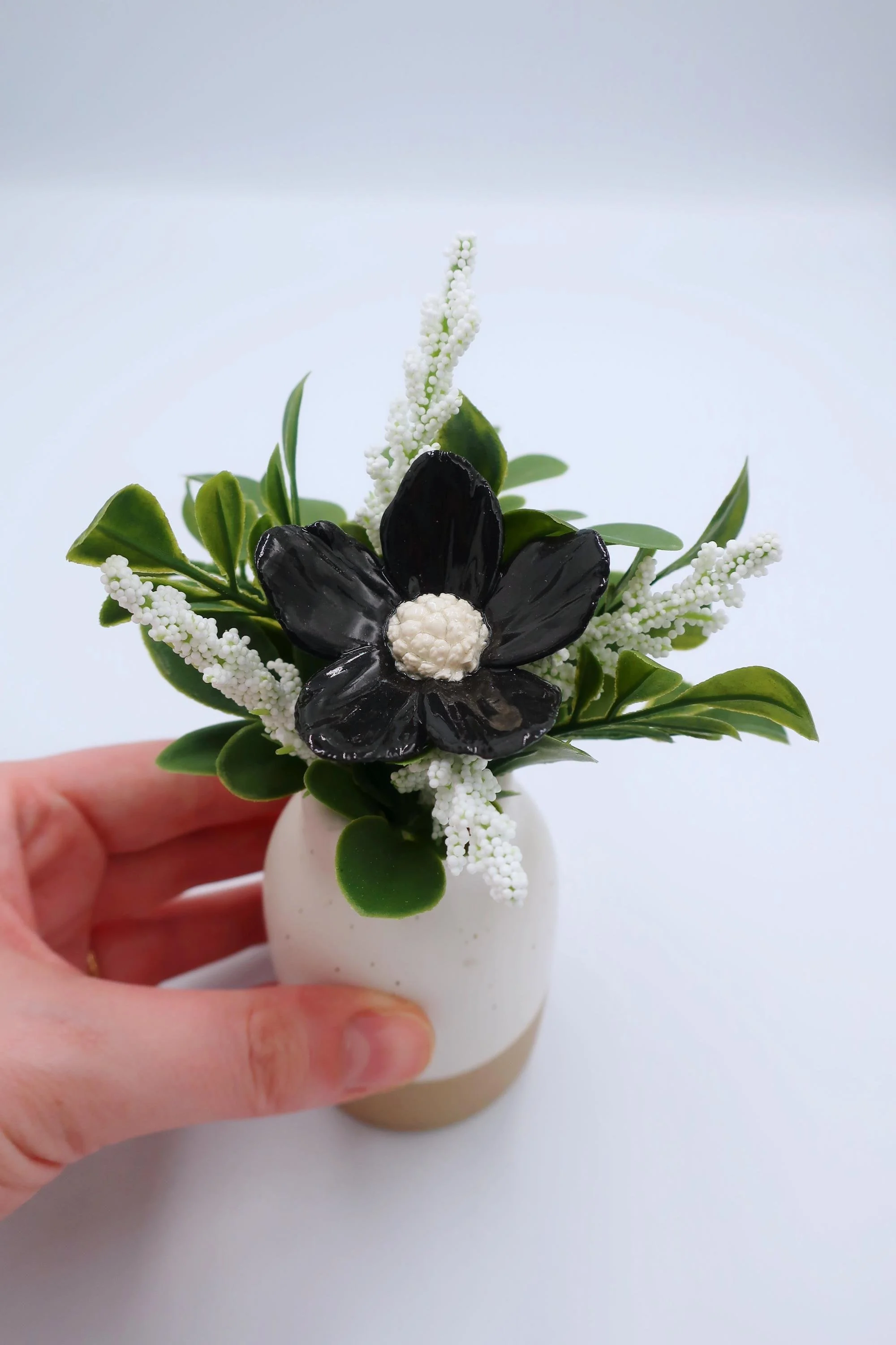 Arrangements › Black & White Arrangement Image 1 of 4 Image 2 of 4 Image 3 of 4 Image 4 of 4 Black & White Arrangement $35.00 Bring a little joy and color into your space with this handcrafted porcelain flower arrangement.Details:Height: 6 inchesWidth: 3 inchesWeight: 6 ozMaterials: Porcelain flower, artificial greenery, ceramic vaseIdeal for:- Small space décor- Desk or shelf styling- Minimalist home accentsMakes a wonderful gift for - Birthdays- Housewarmings- Thank-you gifts- Holidays Add To Cart Added! Bring a little joy and color into your space with this handcrafted porcelain flower arrangement.Details:Height: 6 inchesWidth: 3 inchesWeight: 6 ozMaterials: Porcelain flower, artificial greenery, ceramic vaseIdeal for:- Small space décor- Desk or shelf styling- Minimalist home accentsMakes a wonderful gift for - Birthdays- Housewarmings- Thank-you gifts- Holidays Reviews Reviewer Name Review Date Star Rating Description Posted on Etsy Product Show More