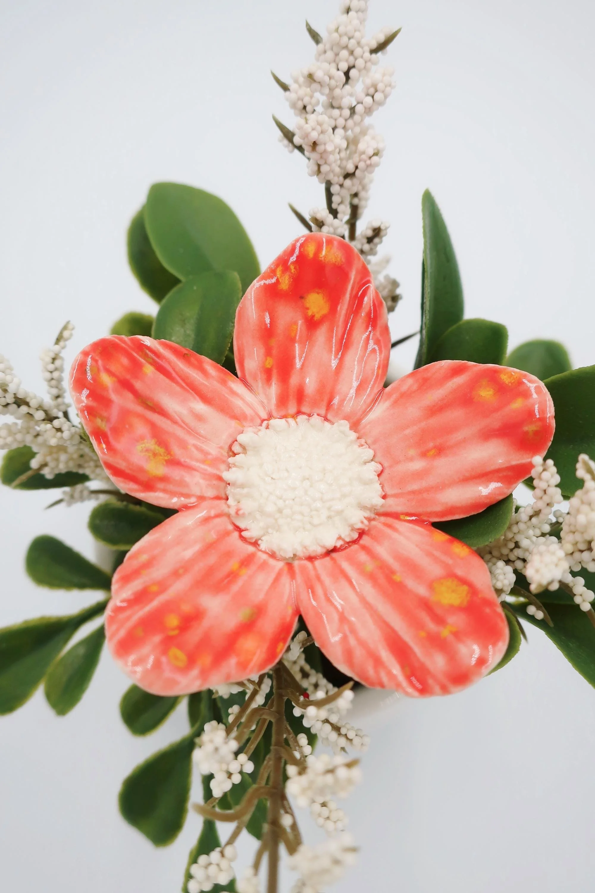 Bring a little joy and color into your space with this handcrafted porcelain flower arrangement.