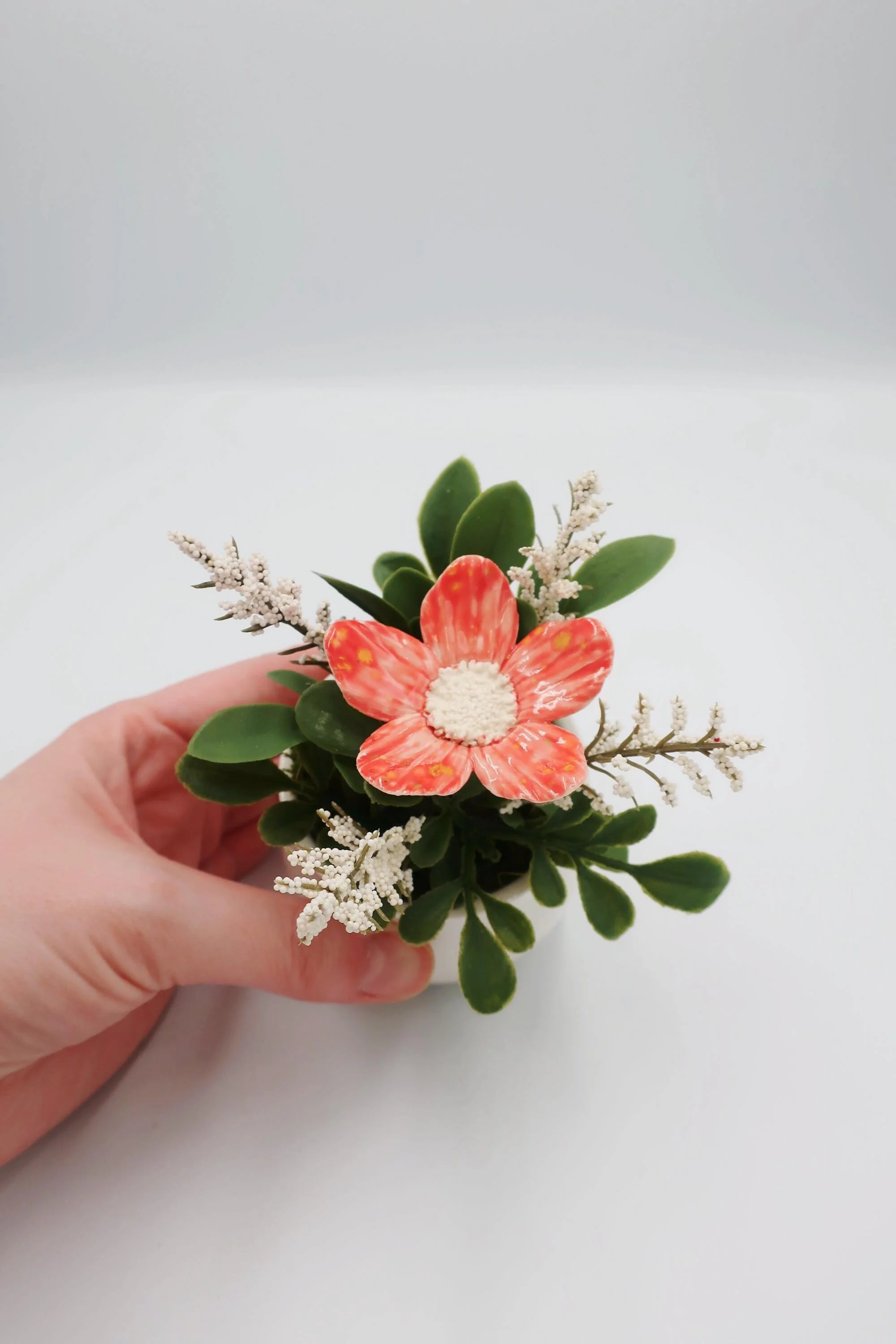Product Details: - Material: Porcelain flower, white ceramic pot, and artificial greenery. - Handmade: Each flower is hand-sculpted in La Jolla, CA - Dimensions: approx. 3×3×4 (LxWxH in inches), approx. 5oz - Ideas: Birthday Gift, Home Office Decor, Hostess Gift…